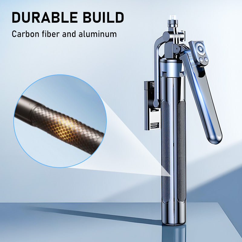 ROBUSTE KONSTRUKTION: Dieser Selfie-Stick aus hochwertigen Carbonfaser- und Aluminiummaterialien bietet hervorragende Festigkeit und Haltbarkeit, ohne dabei an Tragbarkeit einzubüßen.