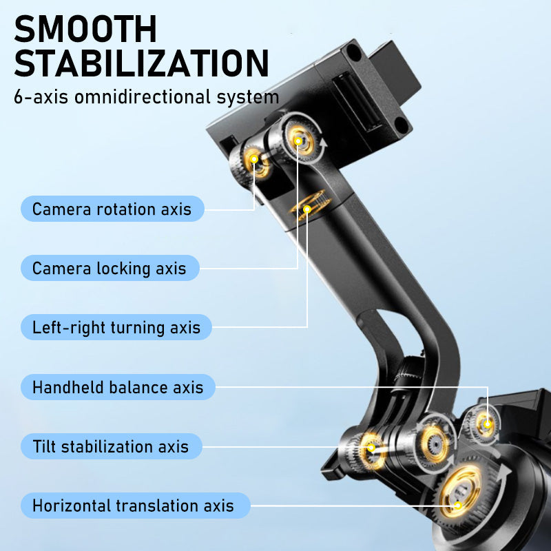 SIX-AXIS OMNIDIREKTIONALE STABILISIERUNG UND EINSTELLBARE HÖHE: Passen Sie die Höhe und den Winkel der Stativbeine individuell an, während das sechsachsige Stabilisierungssystem für flüssige und klare Aufnahmen aus jeder Perspektive sorgt.