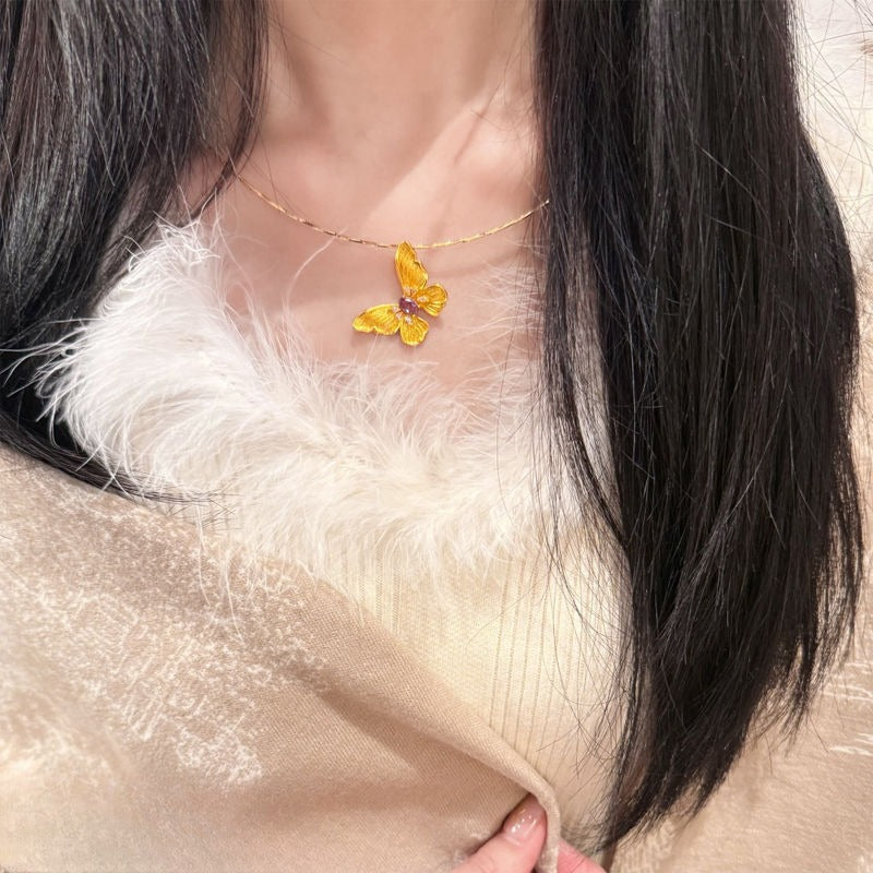 In der Mitte des Schmetterlings funkeln wunderschöne violette Zirkonia-Steine, die einen hinreißenden Farbkontrast zum warmen Gelb bilden. Dieses Spiel aus Leuchtkraft und Tiefe macht das Schmuckstück absolut einzigartig!